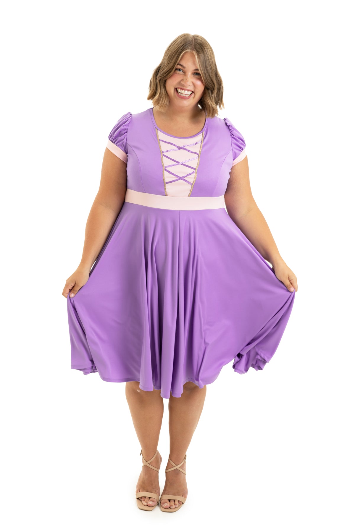 You will look positively delightful and ready to rule over your enchanted kingdom in this Rapunzel twirl dress.