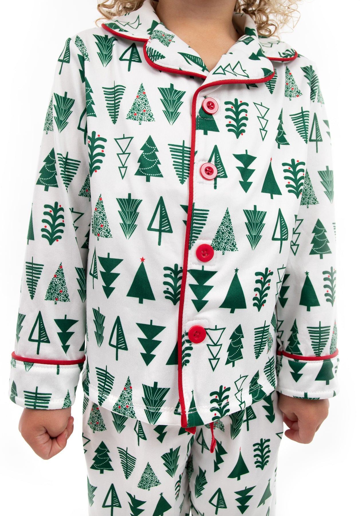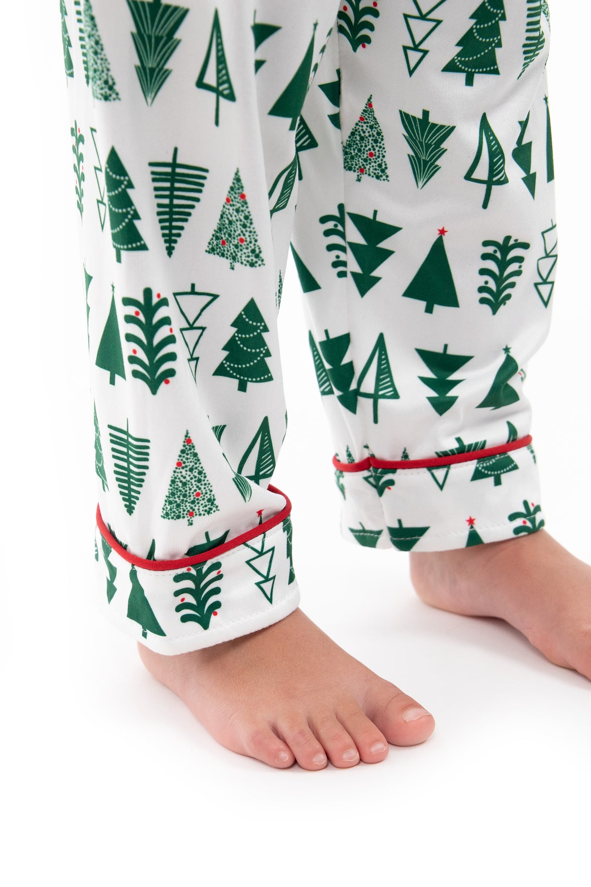 • Festive two-piece pajama set featuring an allover forest of playful holiday tree designs