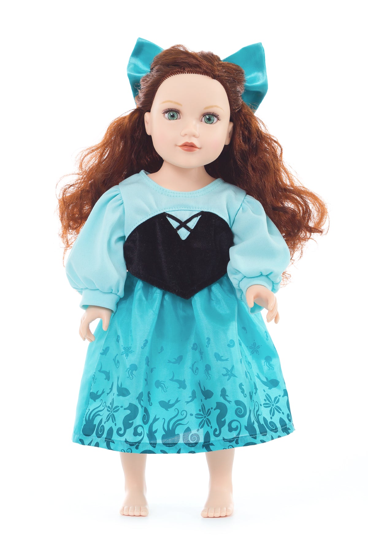 This Mermaid Day doll dress with a hair bow will transform your child’s doll into a beautiful mermaid ready to explore her land legs.