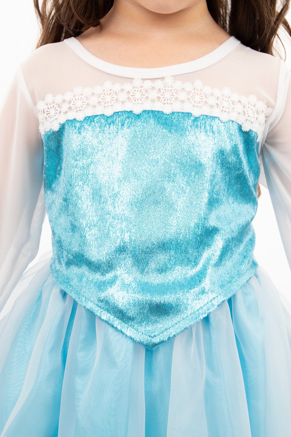 • Soft stretch blue and white velvet bodice, with matching sheer sleeves