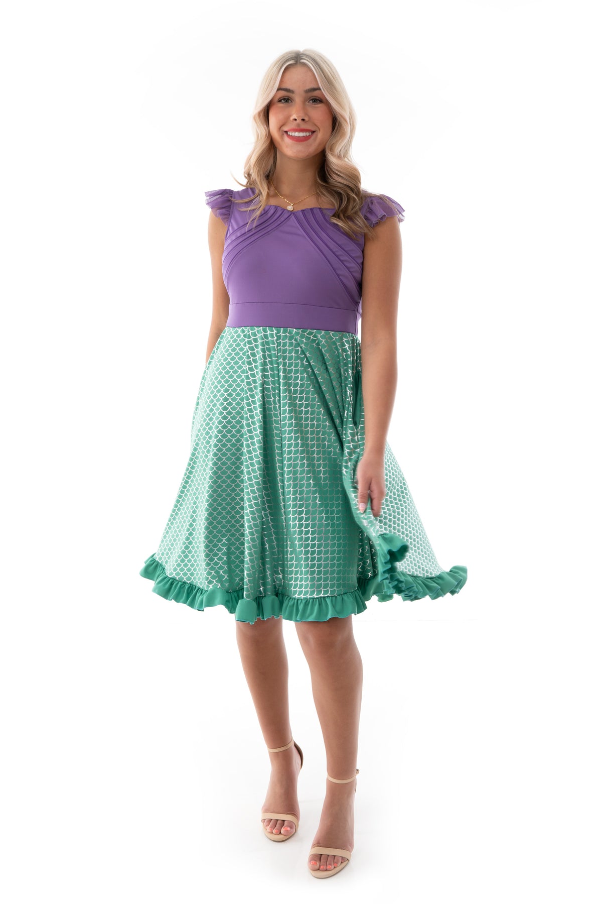 Make waves in the Mermaid Twirl Dress—perfect for ocean daydreams, seaside sparkle, and ruling your undersea realm in style.